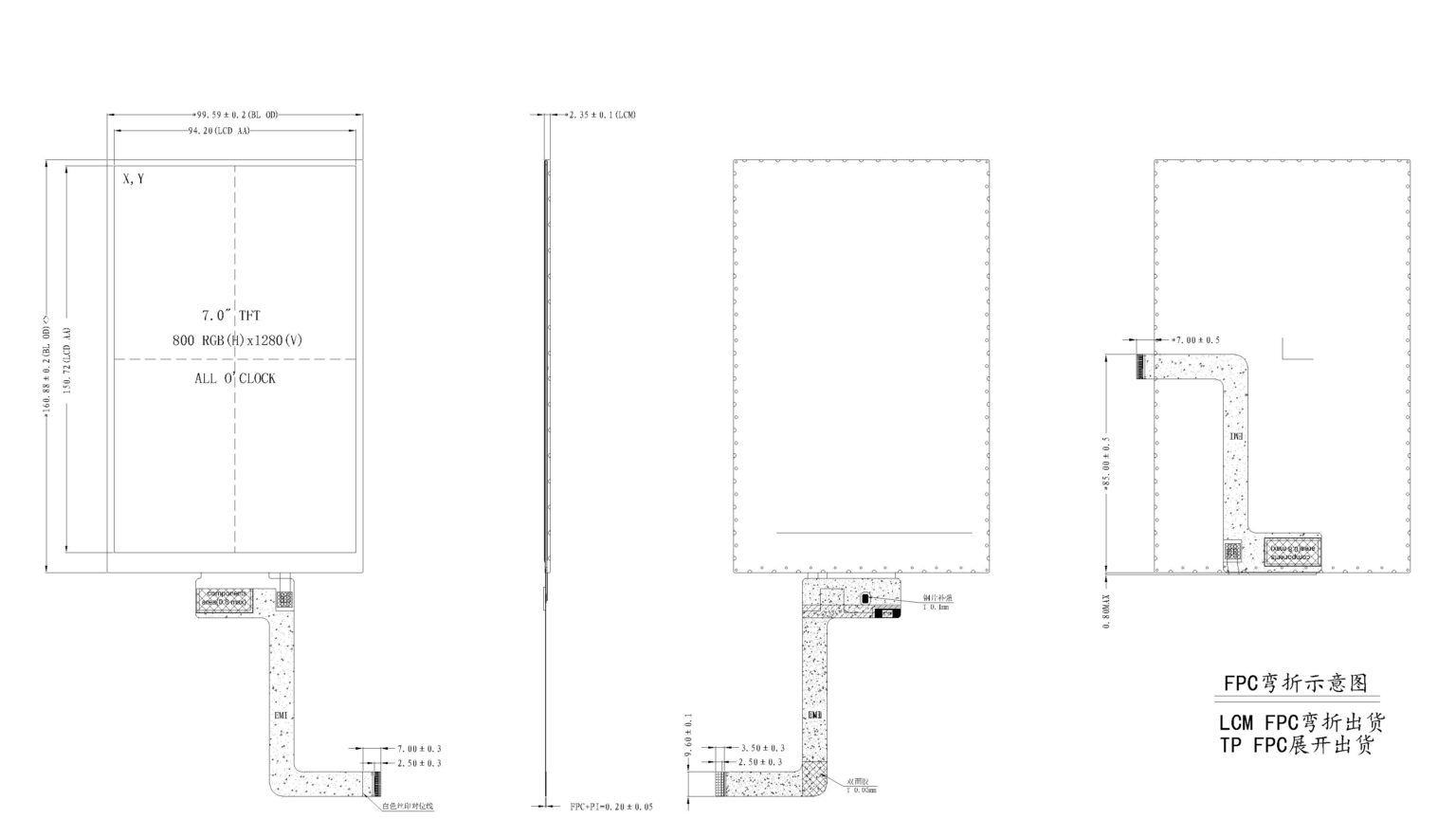 7寸LCD显示屏,纵向IPS高清TFT屏幕,带电容触摸屏。HC-700BJ3102AT分辨率800×1280像素,MIPI 2通道接口IPS LCD屏幕。IPS全视角高端显示屏,掌机显示屏,MP4显示屏的优选方案。